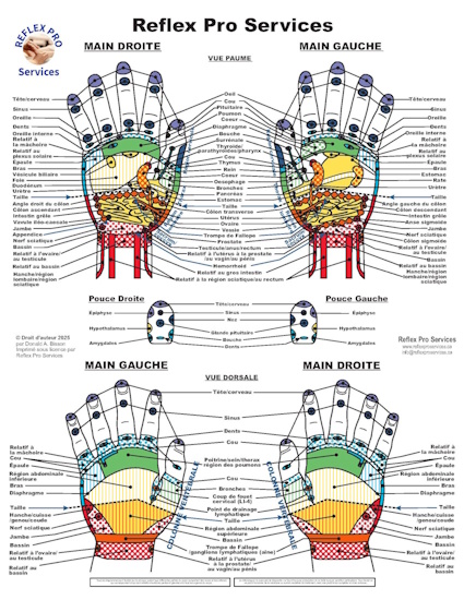 Professional French Reflexology Hand Chart in PDF format (French) in 8.5 x 11 inch format for easy printing.