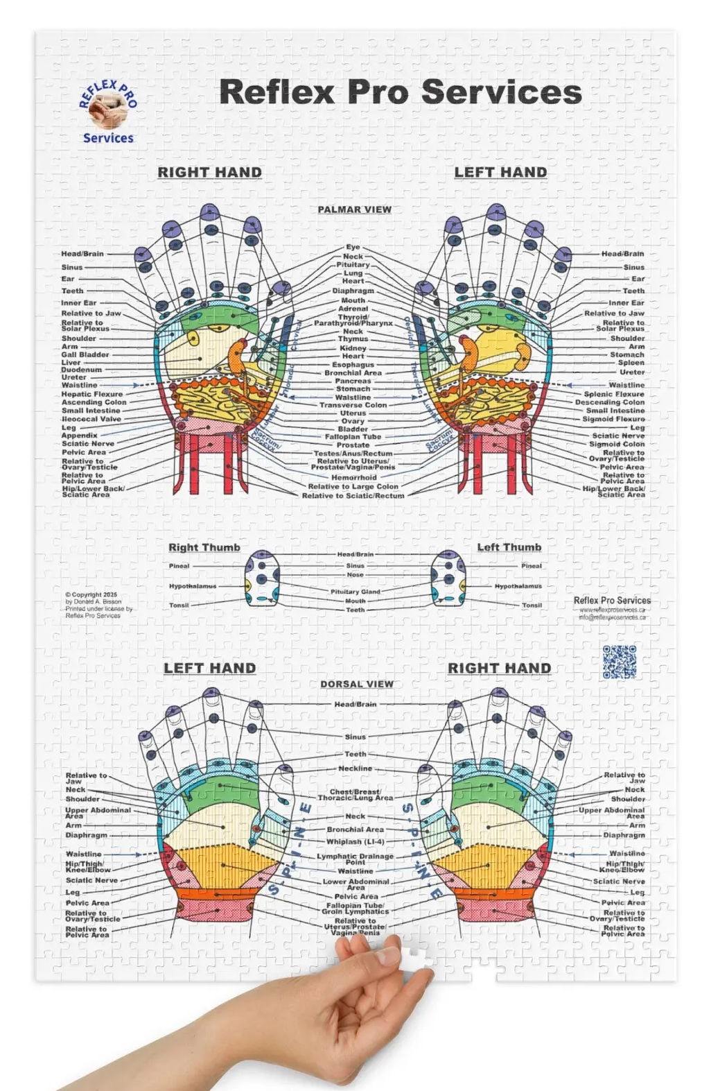 Transform your reflexology learning experience with this one-of-a-kind jigsaw puzzle featuring a professionally illustrated Reflexology Hand Chart with keepsake tin.