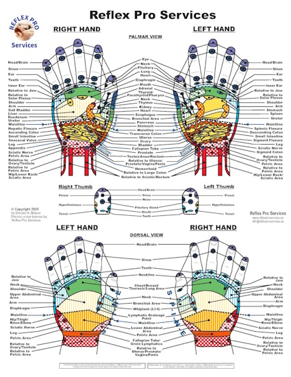Professional Reflexology Hand Chart in PDF format (English) in 8.5 x 11 inch format for easy printing.
